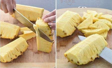 1、削好的菠蘿塊還是要用鹽水浸泡片刻,這樣能抵制菠蘿酶的活力。(擴展閱讀:菠蘿為什么要用鹽水泡?菠蘿要用鹽水泡多久)