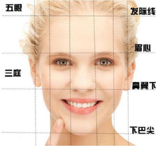 三庭:指臉的長度比例,把臉的長度分為三個等分,從前額發際線至眉骨,從眉骨至鼻底,從鼻底至下頦,各占臉長的1/3。五眼:指臉的寬度比例,以眼形長度為單位,把臉的寬度分成五個等分,從左側發際至右側發際,為五只眼形。兩只眼睛之間有一只眼睛的間距,兩眼外側至側發際各為一只眼睛的間距,各占比例的1/5。